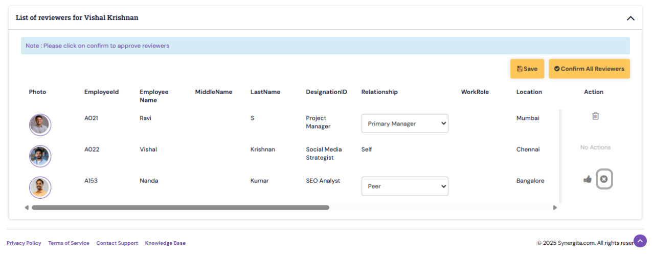- If the manager wants to reject a rater, click the Reject icon to remove the reviewer from the list. After removing, the manager can add a new rater from their end.